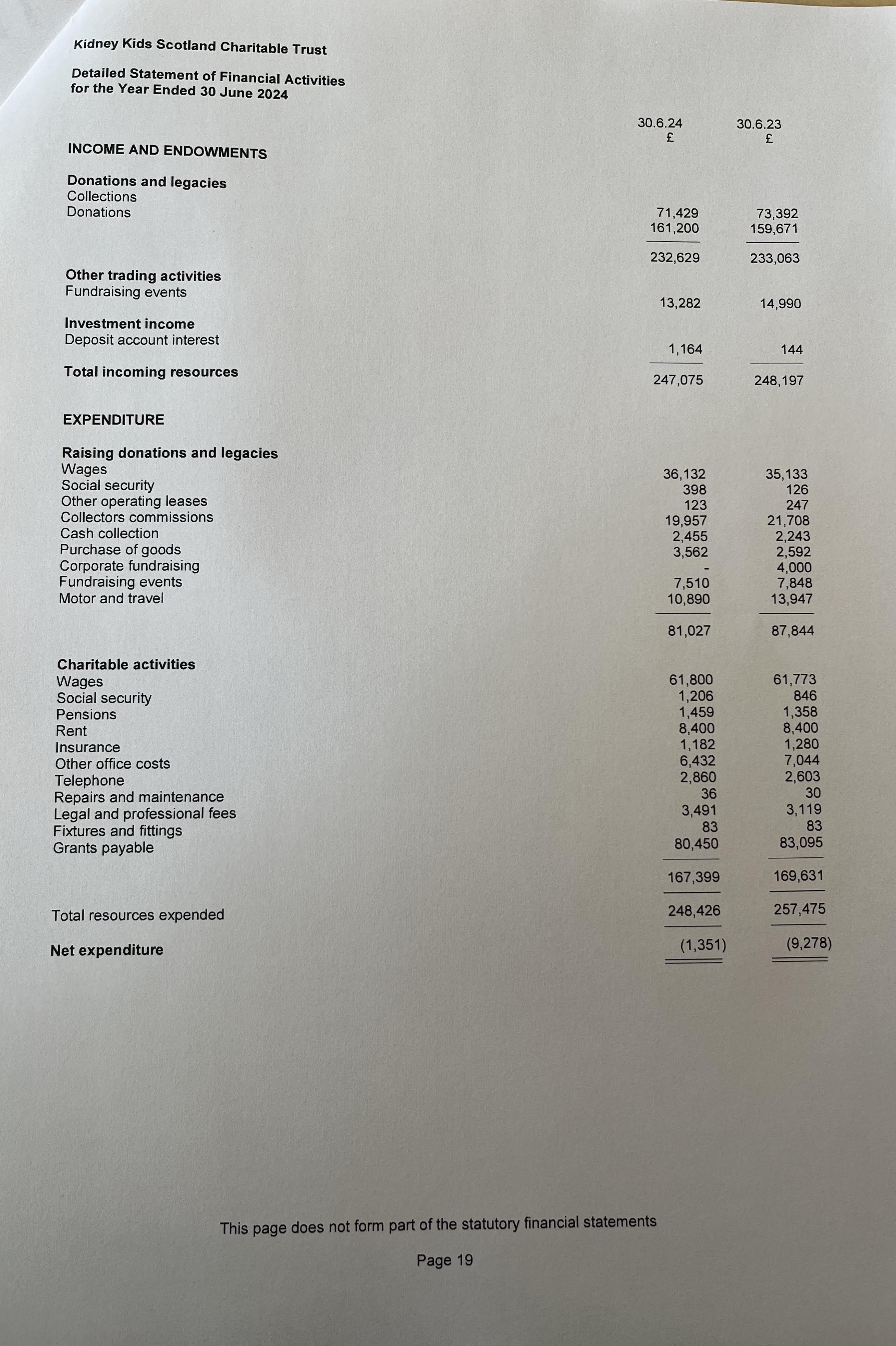 Please find below an account summary of our latest audited accounts. If you would like a full set of our latest account please contact us by email office@kidneykids.org.uk or telephone the office 01324 555843 Monday - Thursday 9am-4pm .