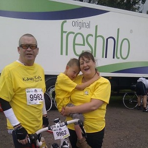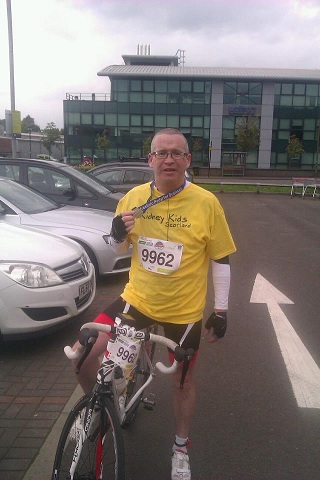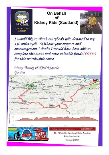 Gordon Martin got on his bike his yellow T shirt and cycled an amazing 110 miles for Kidney Kids Scotland raising £784.75.