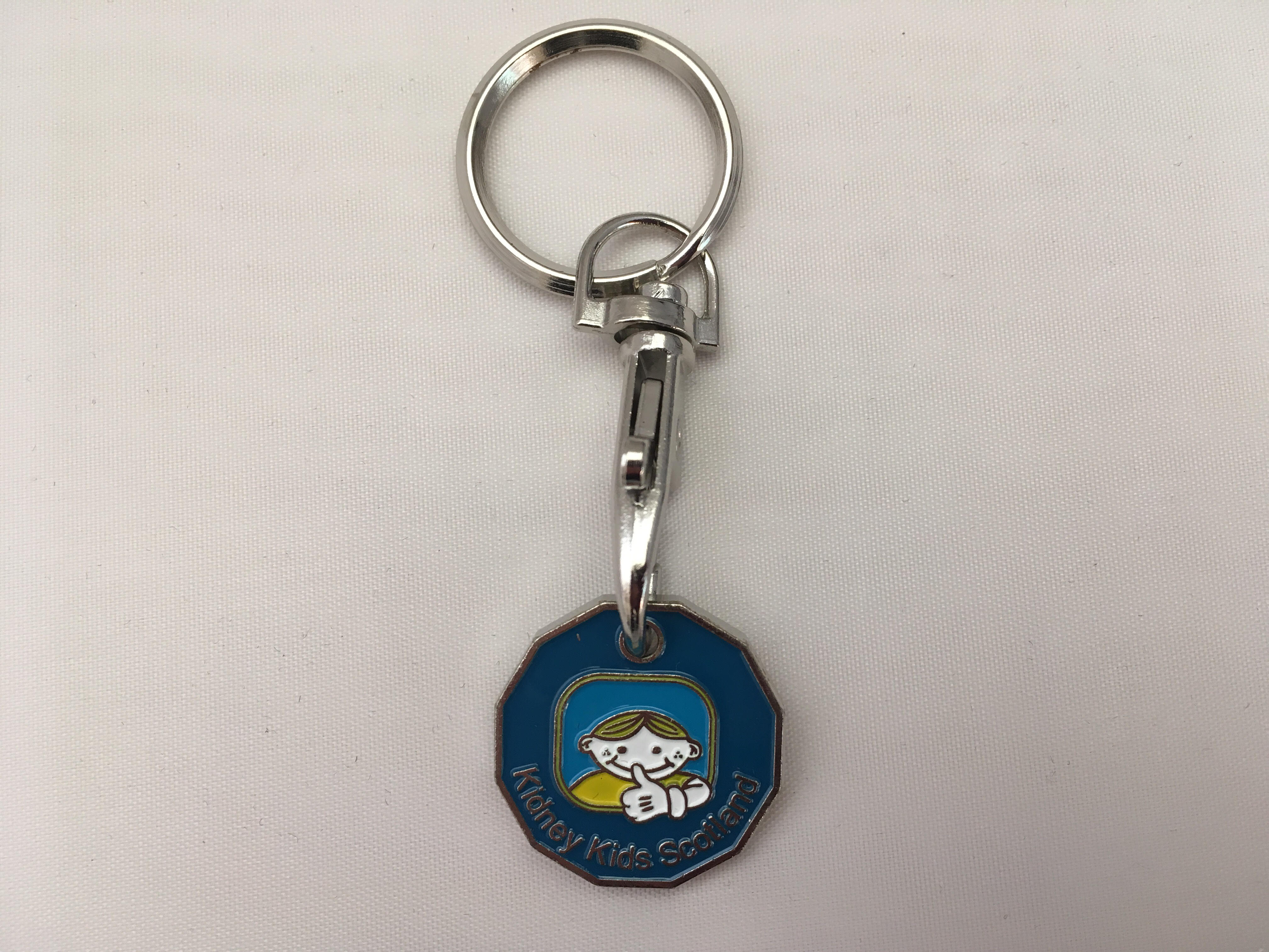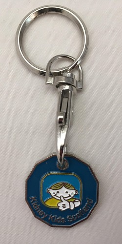 Kidney Kids Scotland Key ring with a detatchable coin. A very handy addition to any set of keys. Useful for supermarket trolleys or lockers. This fits both old and new £1 coin applications.